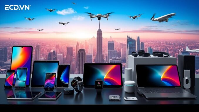 Sản phẩm số bao gồm điện thoại, laptop, TV, đồng hồ thông minh, tai nghe True Wireless và siêu ứng dụng.