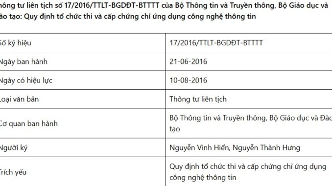 Thông tư liên tịch số 17/2016/TTLT-BGDĐT-BTTTT của Bộ Thông tin và Truyền thông, Bộ Giáo dục và Đào tạo: Quy định tổ chức thi và cấp chứng chỉ ứng dụng công nghệ thông tin